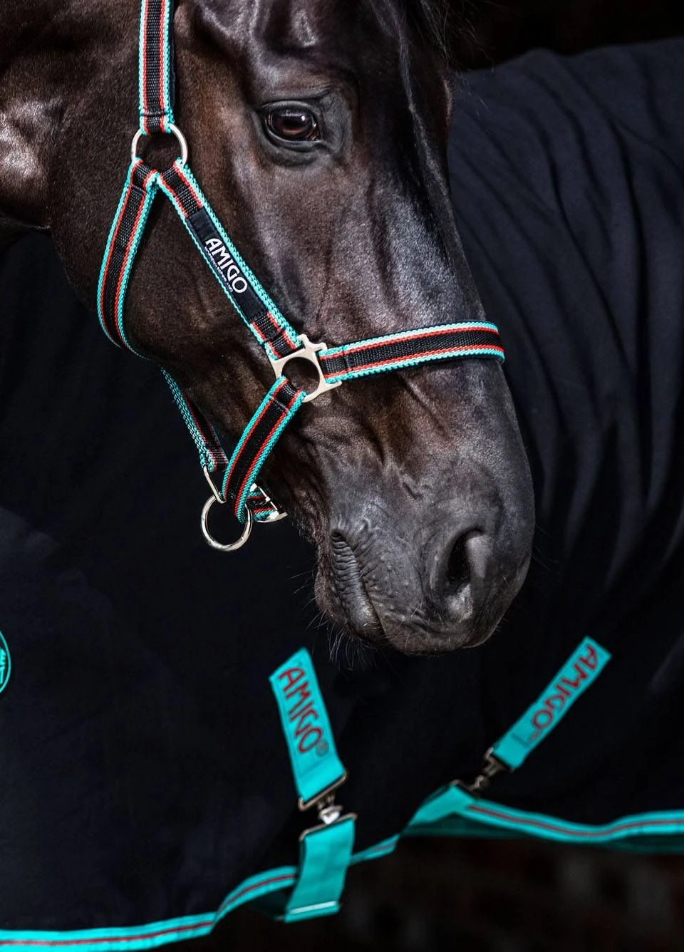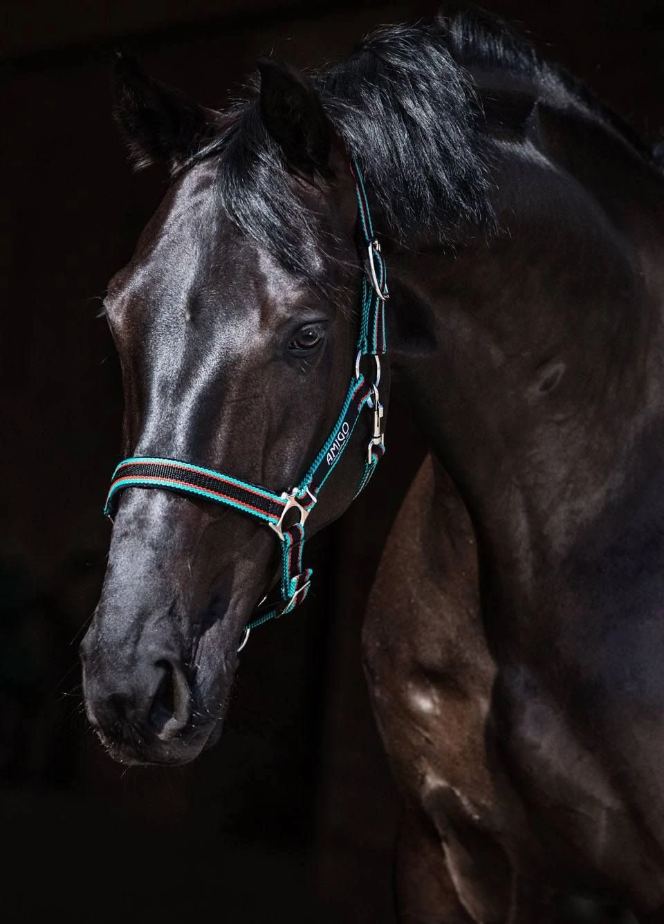 The Black/Teal Amigo Headcollar features a padded nose and headpiece. It has a quick release clip on the cheek and is made from soft but sturdy Nylon.