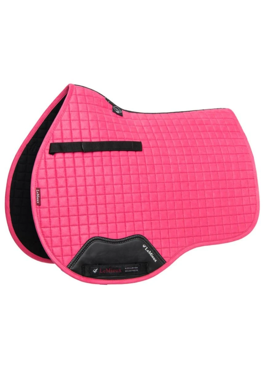 Now with the New Super Soft Suede Binding and New PU Leather Girth Protection area, this beautiful suede General Purpose square sets new standards in style & comfort. Now established as the iconic LeMieux look when combined with matching polo bandages and fly hoods there are colours to suit most horses and tastes. Designed to fit a wide range of general purpose saddles with its high wither, standard long straps & New PU Leather girth protection area. The luxurious suede top side and New Soft Suede Binding is complimented by a super soft Bamboo lining to absorb & control sweat under the saddle and are beautifully comfortable and secure – minimising friction. There are several attractive suede colours with more new ones being added seasonally and a selection of new Small/Med pads in the range to accommodate smaller saddles. Consider matching your Suede GP pad with a Classic Fly Hood & Polo Bandages in the same colourway.